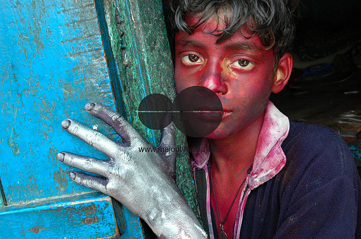 Portrait of a color smeared boy during the colorl festival of holi in Kolkata, India. The colorful festival of Holi is celebrated in late February or early March. Holi festival has an ancient origin and celebrates the triumph of 'good' over 'bad'. The colorful festival bridges the social gap and renews sweet relationships. On this day, people hug and wish each other 'Happy Holi'. February 8, 2005.