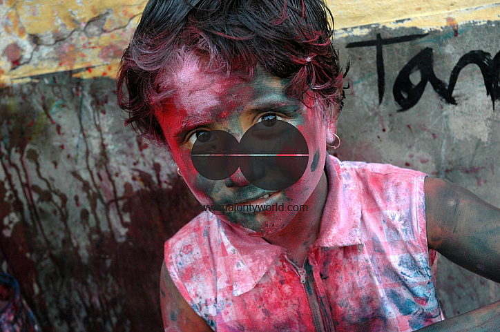 Portrait of a color smeared girl during the colorl festival of holi in Kolkata, India. The colorful festival of Holi is celebrated in late February or early March. Holi festival has an ancient origin and celebrates the triumph of 'good' over 'bad'. The colorful festival bridges the social gap and renews sweet relationships. On this day, people hug and wish each other 'Happy Holi'. February 8, 2005..