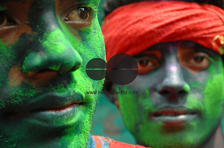 Portrait of two color smeared men during the colorl festival of holi in Kolkata, India.The colorful festival of Holi is celebrated in late February or early March. Holi festival has an ancient origin and celebrates the triumph of 'good' over 'bad'. The colorful festival bridges the social gap and renews sweet relationships. On this day, people hug and wish each other 'Happy Holi'. February 8, 2005..