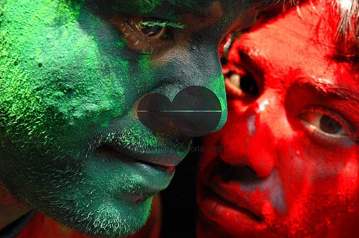 Portrait of color smeared men during the colorl festival of holi in Kolkata, India. The colorful festival of Holi is celebrated in late February or early March. Holi festival has an ancient origin and celebrates the triumph of 'good' over 'bad'. The colorful festival bridges the social gap and renews sweet relationships. On this day, people hug and wish each other 'Happy Holi'. February 8, 2005..