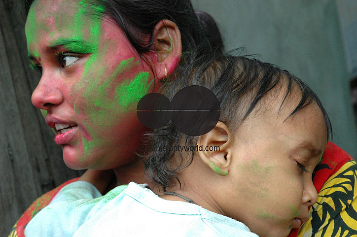 Portrait of a color smeared mother with her child during the colorl festival of holi in Kolkata, India. The colorful festival of Holi is celebrated in late February or early March. Holi festival has an ancient origin and celebrates the triumph of 'good' over 'bad'. The colorful festival bridges the social gap and renews sweet relationships. On this day, people hug and wish each other 'Happy Holi'. February 8, 2005..