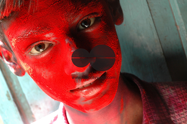 Portrait of a color smeared boy during the colorl festival of holi in Kolkata, India. The colorful festival of Holi is celebrated in late February or early March. Holi festival has an ancient origin and celebrates the triumph of 'good' over 'bad'. The colorful festival bridges the social gap and renews sweet relationships. On this day, people hug and wish each other 'Happy Holi'. February 8, 2005..