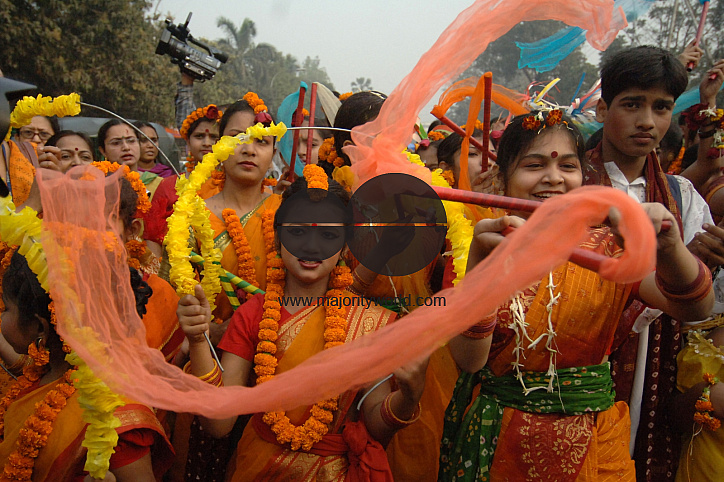 A colorful procession at Dhaka city to celebrate Pahela Falgoon (The eleventh month of Bangla calendar from mid February to mid March). Bangladesh. February 13, 2006.