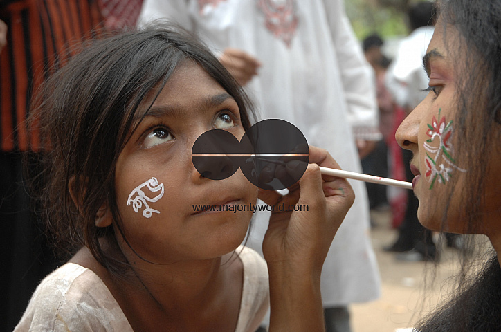 Seeing people having lots of fun with colorful painting on them the street child entreated for one on herself too during the Bangla New Year festival. Dhaka, Bangladesh. 2006.