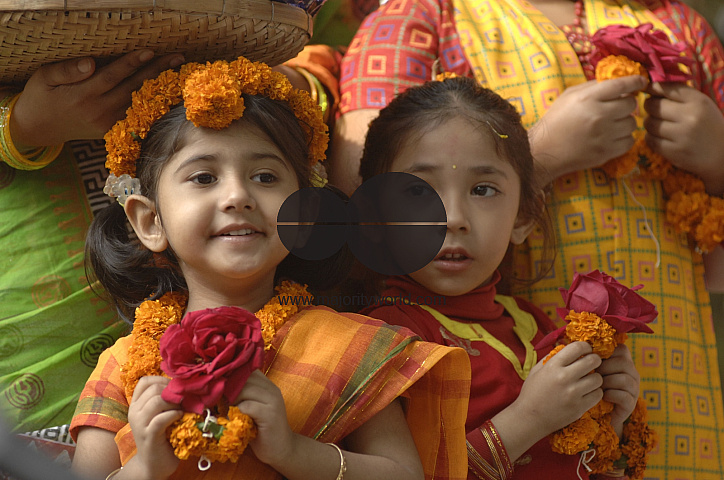 Portrait of child girls in colorful dresses during the Pahela Falgoon (Eleventh month of Bangla calendar from mid February to mid March) festival at Fine Art Institute (Charukala Bibhag) of Dhaka University. Bangladesh. February 13, 2007.