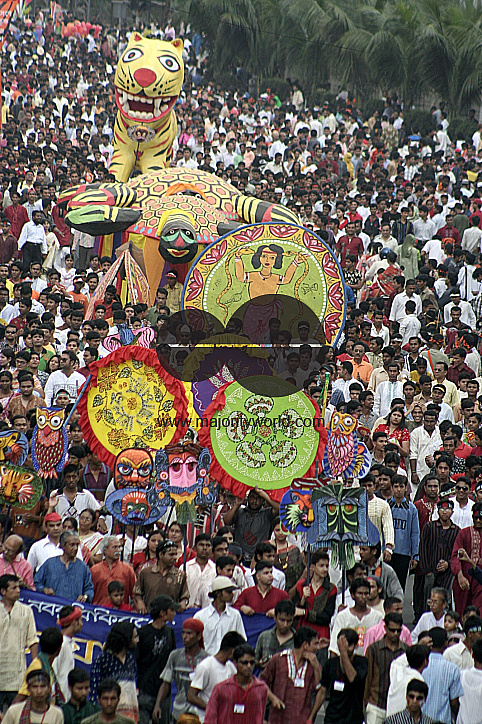 Millions of Bangladeshi people including men, women and children celebrate the Bangla New Year (1414) or Pahela Baishakh festival as its origin is rooted deep in the cultural tradition of the nation. The festival is celebrated with colorful rally, music, dance, theatre, foods and stalls, etc. Dhaka, Bangladesh. April 14, 2007.