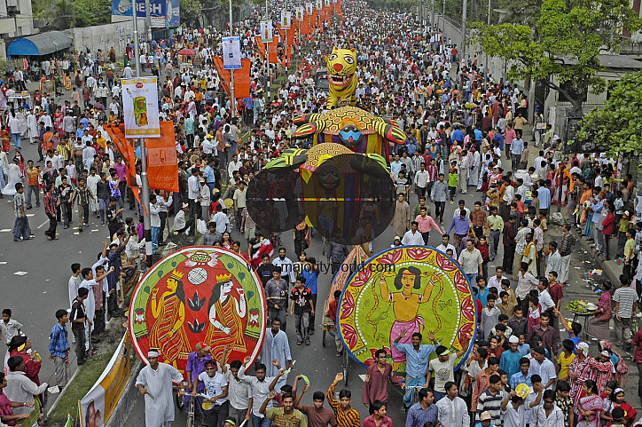 Millions of Bangladeshi people celebrate the Bangla New Year 1414, or Pohela Baishakh, a festival rooted deep in the cultural tradition of the nation. The festival is celebrated with colorful rally, music, dance, theatre, foods and stalls, etc. Dhaka, Bangladesh. April 14, 2007.