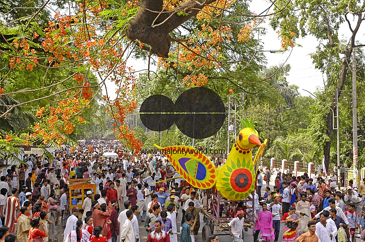 Millions of Bangladeshi people celebrate the Bangla New Year 1413, or Pohela Baishakh, a festival rooted deep in the cultural tradition of the nation. The festival is celebrated with colorful rally, music, dance, theatre, foods and stalls, etc. Dhaka, Bangladesh. April 14, 2007.