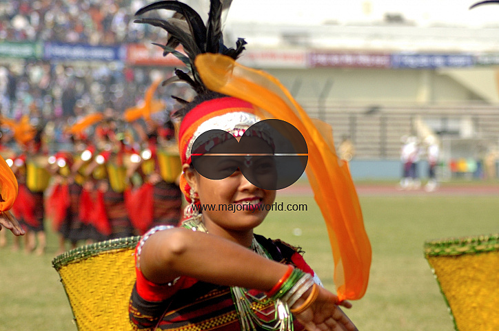 A Member of the Birisiri Tribal Cultural Academy performs dance to celebrate the 36th victory day anniversary at the Bangabandhu National Stadium in Dhaka, the capital city of Bangladesh. Dhaka, Bangladesh. December 16, 2007