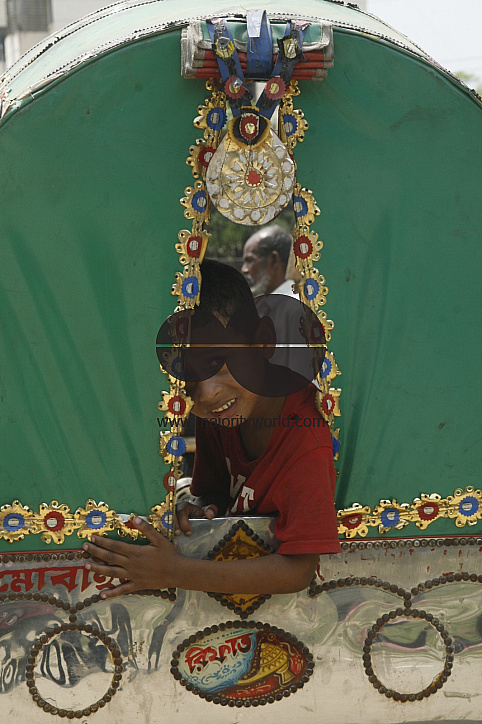 A child looks on as his father; a rickshaw puller, who is at a queue in front of a fair price shop, run by Bangladesh Rifles, BDR, in Ajimpur, Dhaka. Bangladesh. April 04, 2008.