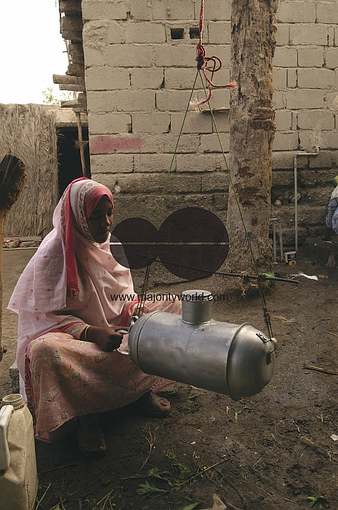 A Bandari woman, woman with ethnic background, makes butter using specially made tin-container in a village near Menab city in Hormogan Province. Iran. January 26, 2004.