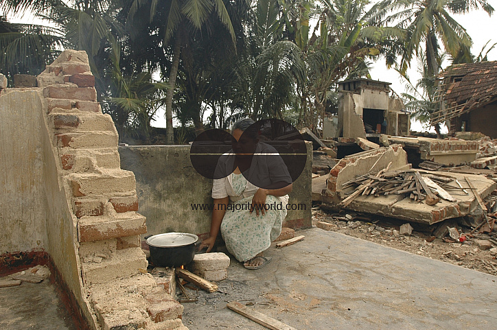 L. P. Shiryani cooks where her house used to be, now completely destroyed. Her house is less than 150 meters from the sea. When the water came, she was thrown over 1/2 km away from her home and severe injures in her legs. She said, Our house is all gone, but at least we have the land. God took what he had to, but now government is after what is left. We are not allowed to rebuild near the sea anymore..Kottagoda village, 9 km south of Matara city in Matara district..Note: According to new regulations recently announced, no one can build residential homes less than 300 meters from the sea and commercial properties less than 100 meters from the sea.