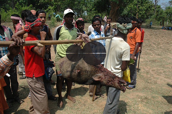 Tribal men carrying a wild pig killed by them during a hunting festival in the Ayodhya hills of Purulia district,India. Tribal people participate in the festival which takes place every year on the birth day of the Lord Buddha. Although the law prevents hunting of wild animals, this ritual is allowed to continue to respect the tribal tradition.