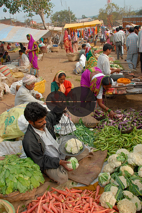 Farm fresh vegetables such as bengan (brinjal), gobi (cauliflower), gajar (carrots) being sold at an open market at a village fair, known as "Haat". Nagpur, Maharashtra, India. January 29, 2007.