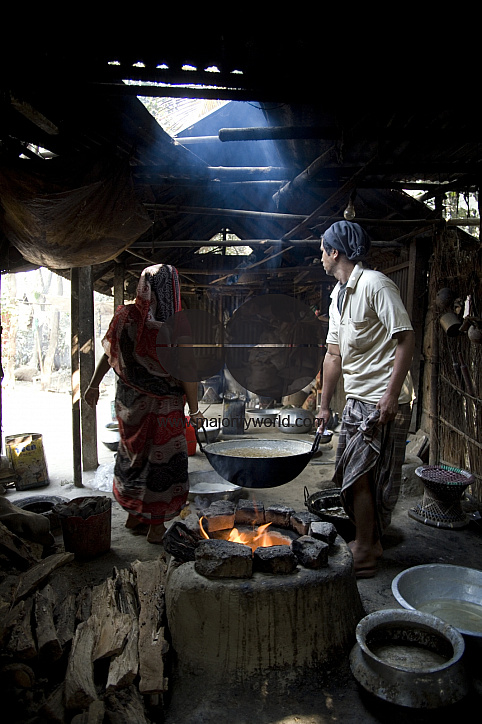 Kanchan Rani Das from Nayapur, runs sweet making business with her husband Harikanta Das. She makes local sweets like Kalojam, Roshogolla, Mishti Nimki etc. at her home kitchen. She has two daughters and one son. They borrowed One lakh nineteen thousand (119, 000) taka from Grameen Bank, of which 50% has been paid off. Harikanta Das sells the sweets at the village market. Nayapur, Narayanganj, Bangladesh. January 28, 2007.