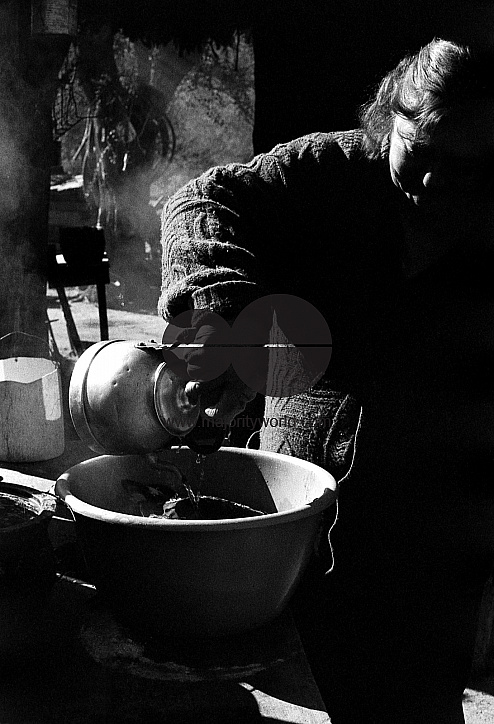 A woman prepares a chicken for cooking. Boiled water makes it easy to take away the feathers. Vinal Pozo, Santiago del Estero, Argentina. June 2009.