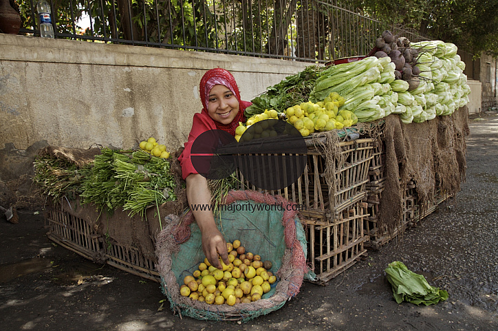 Asma, 12 years old, sells vegetables in west Helwan neighbourhood in suburban Cairo. Although she sits just outside the Red Crescent building, she does not know or heard anything about programs run for children by the Red Crescent. June 28, 2007.