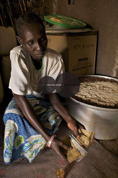 A woman makes wine from dates. She took a loan of 500 Sudanese pounds from BRAC Micro Finance Program and bought enough raw materials to start a wine business. Her profit is almost four times more than what she invests. Torid, South Sudan. December 14, 2008.