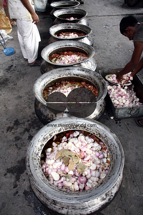 Local chefs cooking food for a feast. Mezban (Persian word meaning host) stands for community feast, with a simple menu of rice and beef-curry only. Its a tradition of Chittagong mainly observed by the rich. Chiefly a mezban is held on the birth and death anniversary of the Prophet Muhammad (sm) that is 12th day of the lunar month Rabiul Awal. Besides, mezban is also held on other occasions such as the death anniversary of an individual, birth of a child or inauguration of a new business, or celebration of the entrance to a new residence. Winter is a popular season for organizing mezbans. Chittagong, Bangladesh. May 18, 2010.