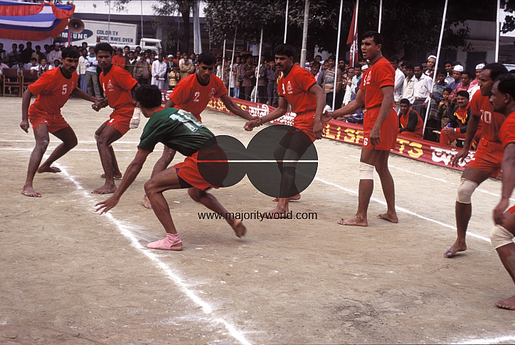 Kabadi, the national game of Bangladesh, is a popular form of entertainment in rural areas. Two teams, 7 players from each set, take part in the sport. It is also a regular event in the SAF games. Dhaka, Bangladesh. December 1997.