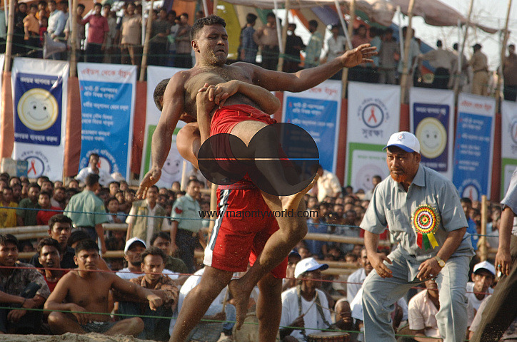 Wrestling at the popular wrestling festival 'Jabbarer Bali Khela' in Chittagong, Bangladesh. Jabbarer bali khela is the most popular wrestling event in Chittagong, generally held in the first half of the Bangla month of Baishakh amid great fanfare and festivity. April 25, 2006.