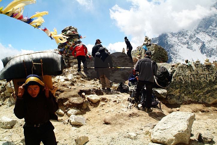 A Nepali porter goes ahead of the rest of the climbers who have decided to take pictures and pay their respects at Thokla Pass where several memorial stones are piled up in remembrance of those who have died on Everest, Nepal. April 25, 2007.