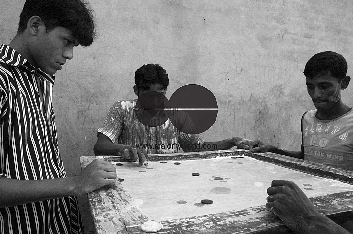 Ibrahim leans his hand against a carrom board as his three friends play the game, which is popular in most of Bangladesh. Dhaka, Bangladesh. June 2, 2007.