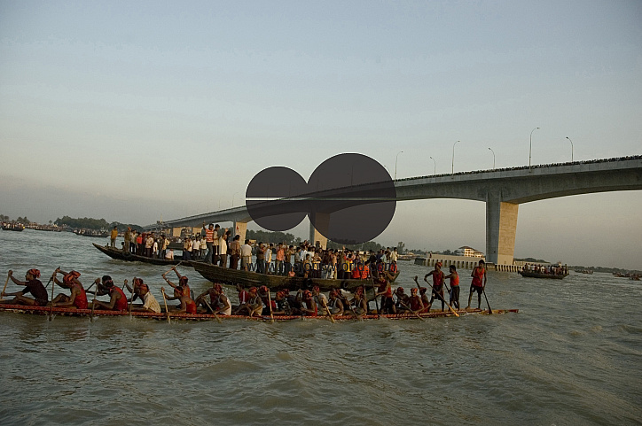 A boat race on the Rupsha River. Traditional boat races are a favourate pastime with in the rural areas of Bangladesh during the rainy season when rivers are filled to the brim. Special types of boats are built for the competitions which are held with muc
