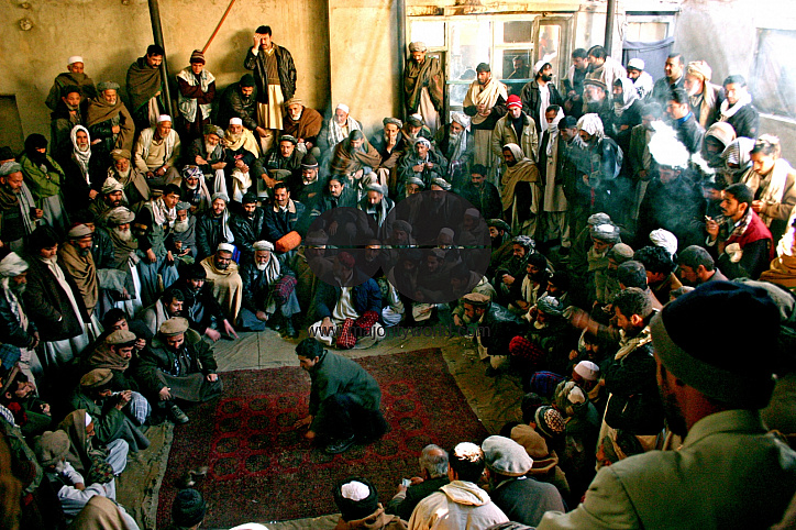 Afghan men gathered at a private house where Bird fighters brought their birds called Bodana for fighting; either for pleasure or for money. Afghanistan. December 13, 2007.