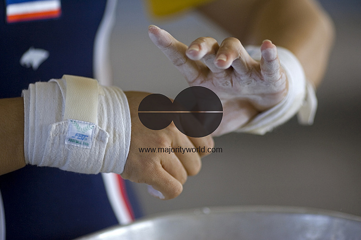 Gold medalist body builder Pavina Thongsuk at a military camp in Maerim district powdering her hands with bandage. Maerim, Thailand. January 19, 2007.
