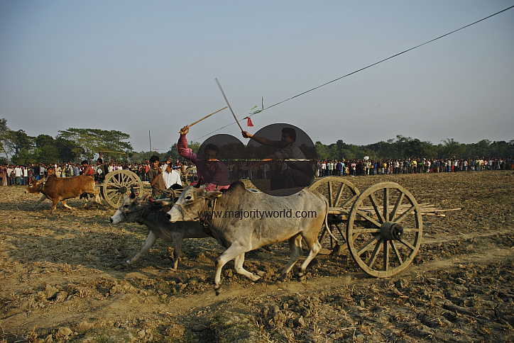 Bullock cart race or Gorur Gari Dabor is a common scene of the rural areas of Jessore during winter. The race begins after harvesting of Amman Paddy when vast area of crop fields becomes open. The sporting event is celebrated with lots of gaiety and festivity. There are two men on each of the carts. Four or five carts take part in an event. The length of the racing ground is about 300 meters. On this occasion, village fairs take place near the racing ground. This type of traditional sporting event has been taking place in this region for a long time. Kashempur, Jessore, Bangladesh. January 12, 2008.
