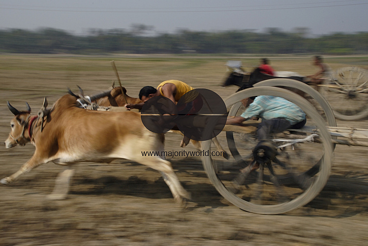 Bullock cart race or Gorur Gari Dabor is a common scene of the rural areas of Jessore during winter. The race begins after harvesting of Amman Paddy when vast area of crop fields becomes open. The sporting event is celebrated with lots of gaiety and festivity. There are two men on each of the carts. Four or five carts take part in an event. The length of the racing ground is about 300 meters. On this occasion, village fairs take place near the racing ground. This type of traditional sporting event has been taking place in this region for a long time. Dorajhat, Jessore, Bangladesh. January 8, 2008.
