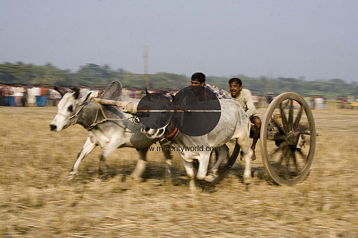 Bullock cart race or Gorur Gari Dabor is a common scene of the rural areas of Jessore during winter. The race begins after harvesting of Amman Paddy when vast area of crop fields becomes open. The sporting event is celebrated with lots of gaiety and festivity. There are two men on each of the carts. Four or five carts take part in an event. The length of the racing ground is about 300 meters. On this occasion, village fairs take place near the racing ground. This type of traditional sporting event has been taking place in this region for a long time. Jessore, Bangladesh. January 8, 2008.