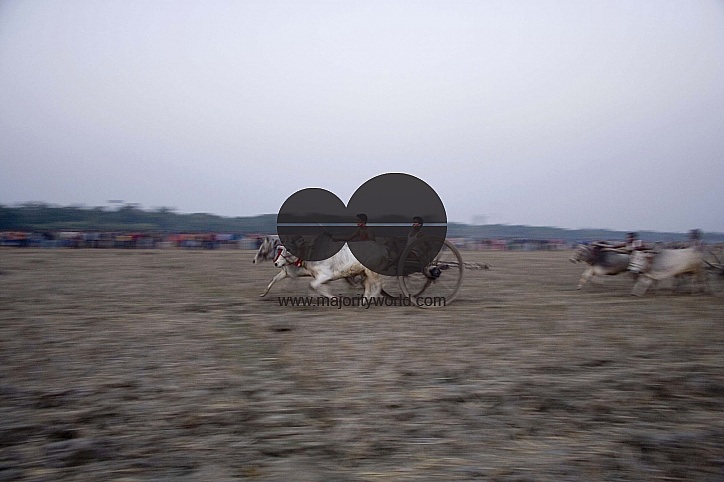 Bullock cart race or Gorur Gari Dabor is a common scene of the rural areas of Jessore during winter. The race begins after harvesting of Amman Paddy when vast area of crop fields becomes open. The sporting event is celebrated with lots of gaiety and festivity. There are two men on each of the carts. Four or five carts take part in an event. The length of the racing ground is about 300 meters. On this occasion, village fairs take place near the racing ground. This type of traditional sporting event has been taking place in this region for a long time. Jessore, Bangladesh. January 8, 2008.