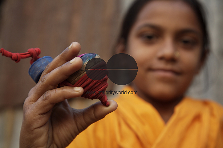 A girl plays with a traditional top locally known as lattu or latim, at a slum, in Baridhara Lake area of Dhaka city, in Bangladesh. February 22, 2007. This is a very popular and simple game which can be played by children as young as 5. The game involves spinning a lattu - a solid turnip shaped wooden toy with a grooved lower half with two nails dug at the top and the bottom. A cotton string is wrapped around the lower half of the lattu. The lattu is then thrown on the ground with a jerk and the string is pulled out as the lattu moves round. The children take turns at spinning the top, and the one who spins it the longest, is the winner.