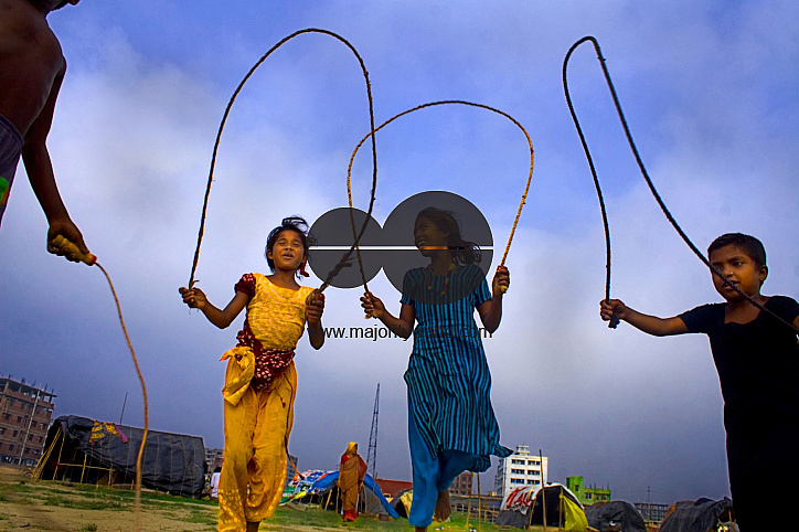 Girls from the ethnic Bedey community playing a local game with skipping loops. Bedeys belong mainly to the ethnic Mong-tong group from the ancient Burmese state of Arakan who settled in Bikrampur near Dhaka and later spread out to remote areas of Bengal and Assam. Traditionally they practice folk medicine and spiritual healing for livelihood, besides being snake catchers and snake charmers. The community generally lives in clusters on manchas (platforms), or shacks by the side of rivers or on boats. Dhaka, Bangladesh. 2007.