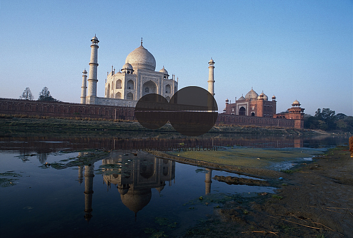 Taj Mahal and it's reflection in the bank of Jamuna River. This grand palace like shrine was constructed by Moghul Emperor Shahjehan in the memory of her famous queen Noorjehan in Agra City, India.
