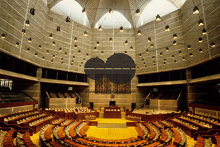 The assembly chamber of the House of Parliament or Sangsad Bhaban, in Bangladesh. This magnificent building is considered to be one of the finest examples of modern architecture. Designed by Louis I Kahn in the 80s, it is situated in Sher-e-Bangla Nagar, in Dhaka. 1990.