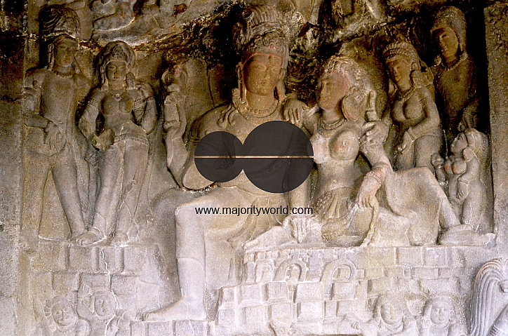 Stone carving at Ellora (archeological site), Maharashtra, India. Ellora is a World Heritage Site famous for its monumental caves. The 35 "caves" actually structures excavated out of the vertical face of the Charanandri hills comprised of Buddhist, Hindu and Jain cave temples and monasteries, were built between the 5th century and 10th century. The 12 Buddhist (caves 1-12), 17 Hindu (caves 13-29) and 5 Jain caves (caves 30-34), built in proximity, demonstrate the religious tolerance prevalent during this period of Indian history. August 16, 2007.