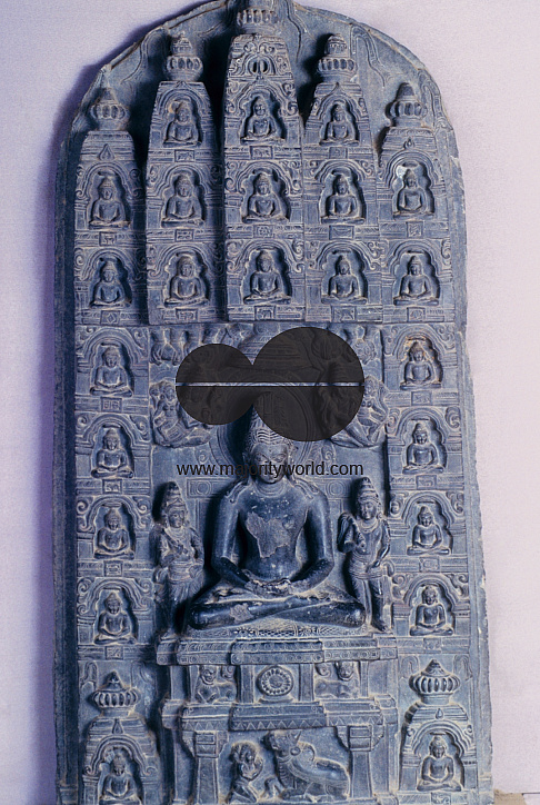 Sandstone image of Rishabhanath (the first of the twenty four Crossing Makers of Jain religion) from Surohor, now in Varendra museum in Rajshahi, Bangladesh. Lord Rishabhanath is seated in padmasana pose (yogic posture) with a bull as his vehicle; the other 23 Crossing Makers are seen inside miniature shrines around. 2000.
