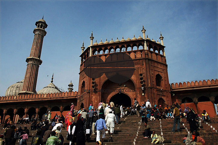 The Jama Masjid (mosque) lying at the origin of a very busy street of Old Delhi, Chandni Chowk, is the largest mosque in India. It was built in 1655 during the reign of Mughal Emperor Shah Jahan. Delhi, India. February 5, 2010.