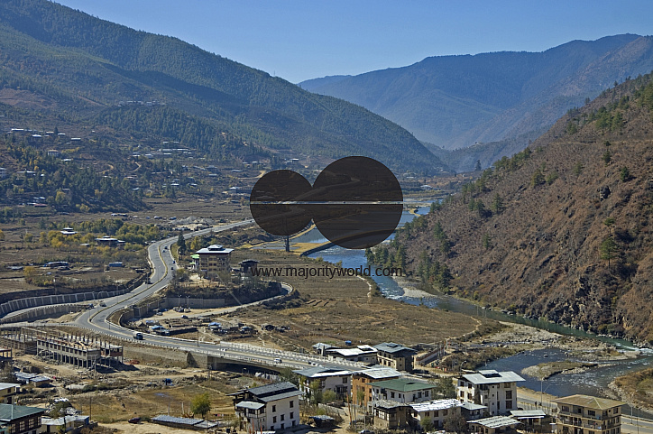 Landscape of Thimphu, the capital city of Bhutan. Thimpu became a town in 1961 and grew as the capital of Bhutan. Before 1960, Thimpu was a small settlement but was developed by the King Jigme Dorje Wangchuk to replace the ancient capital of Punakha.Today the city sprawls across the western slopes of the Wang Chhu river valley, with several government offices located around Tashichoe dzong. November 21, 2007.
