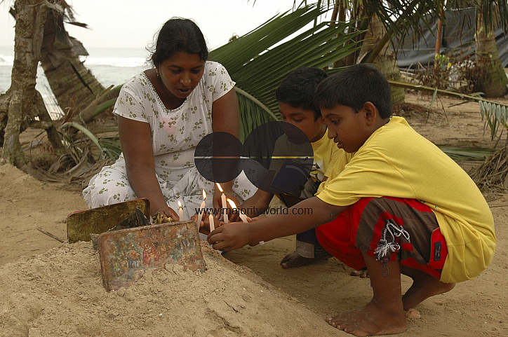 Supan (center) with his brother and mother, light candles on the graves of her younger sister and grandmother, who died in the tsunami and buried in the compound of the fallen house..My sister dead. My grandmother dead, said Supun (11 years old)..He was in the house when water came in. He was taken by surprise. He somehow managed to get to the first floor from where he saw his grandmother struggling to save his little sister. He saw them both floating away and after a while swallowed by the water..Piyadegama village in near Hikkaduwa town in southern Sri Lanka.