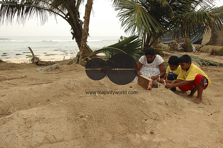 Supan (center) with his brother and mother, light candles on the graves of her younger sister and grandmother, who died in the tsunami and buried in the compound of the fallen house..My sister dead. My grandmother dead, said Supun (11 years old)..He was in the house when water came in. He was taken by surprise. He somehow managed to get to the first floor from where he saw his grandmother struggling to save his little sister. He saw them both floating away and after a while swallowed by the water..Piyadegama village in near Hikkaduwa town in southern Sri Lanka.