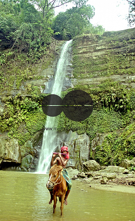 The waterfall at Madhabkunda in Sylhet district- a holy place for the country's Hindu community. Man plays flute riding on a horse beside the waterfall. 2003