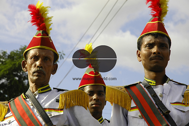 Members of an ensemble stand as they are ready to play an orchestra in a Janmashtami procession arranged in the birthday of Hindu god Krishna in Dhaka, the capital city of Bangladesh. People of Hindu community mark the day with a festive and euphoric marc
