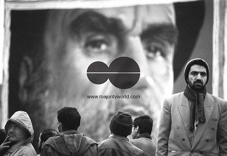 People who gathered for Aid-al Fetr Praying in front of a big poster of Ayatollah Roohollah Komeini, the leader of 1979 Islamic revolution which changed the Kingdom Pahlavi regim to a Islamic Republic. Tehran capital city.