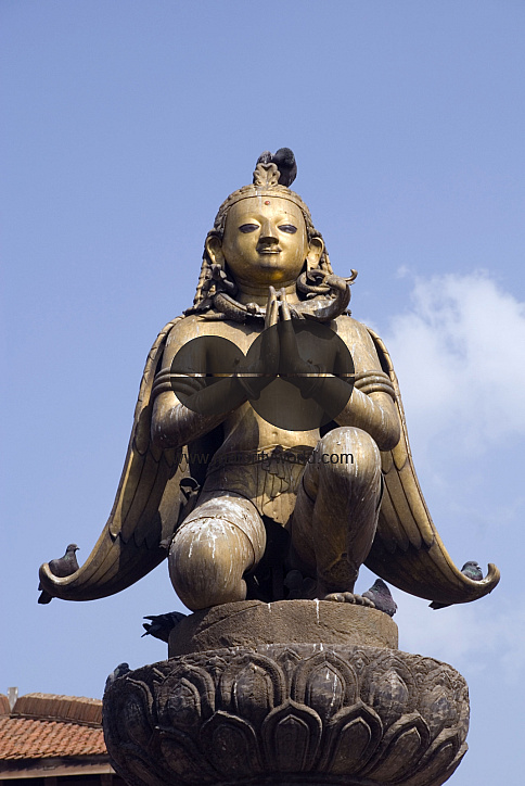 This is a brass statue of 'Garuda' (the vehicle of lord 'Vishnu') in front of the Krishna temple in Patan Durbar Square. The statue sits on a stone pedestal abot 5 feet above the ground at the level of the statue of Lord Krishna that is inside the temple. According to the Hindu mythology Krishna is an incarnation of Vishnu..April 8, 2007.