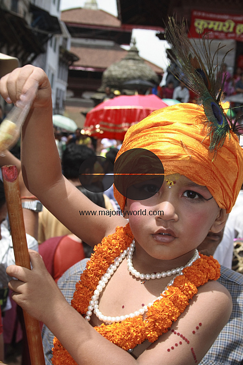 A child dressed in traditional clothes at the festival of Gai Jatra, the procession of cows in Kathmandu. Every family who has lost one relative in the past year participates in this procession through the streets of Kathmandu leading a cow. If a cow is u