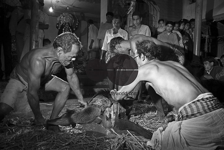 Goats are sacrificed from midnight till early morning at Tildanga, Chalna, Khulna, on the annual festival of Kalipuja. About 300 goats are sacrificed to satisfy Goddess Kali. A one day long fair takes place on the day of sacrifice. This traditional festival is a significant religious event for the villagers around Sundarban and southern part of Bangladesh. February 19, 2008.